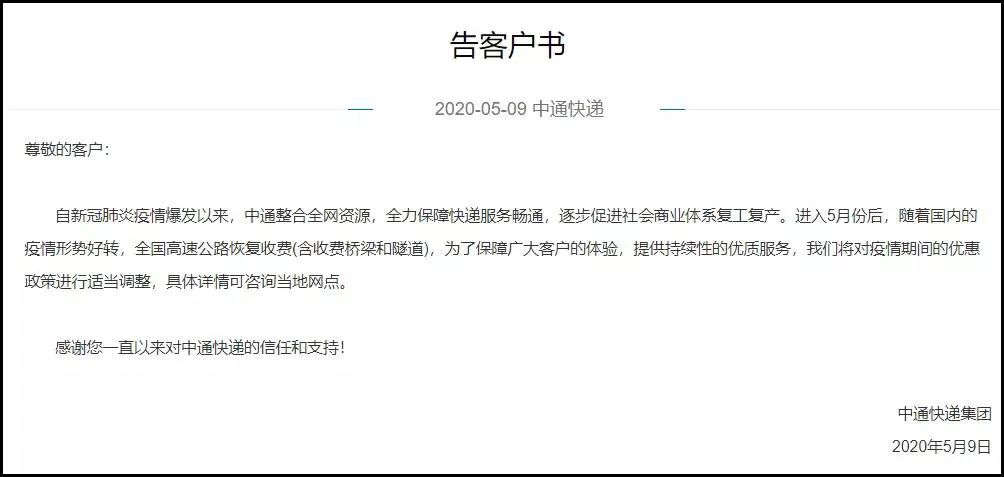 同在9日(rì),中通快(kuài)遞也稱,爲了保障廣大(dà)客戶的體(tǐ)驗,提供持續性的優質服務,将對疫情期間的優惠政策進行适當調整,具體(tǐ)詳情可(kě)咨詢當地網點。