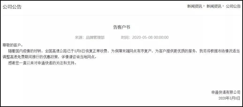 申通快(kuài)遞在公告中表示,爲保障末端網點有序複産,爲客戶提供更優質的服務,将根據市場情況适當調整高速免費期間推行的優惠政策,詳情請(qǐng)咨詢當地網點。