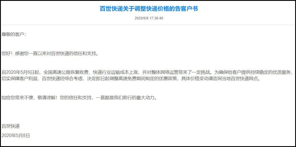 8日(rì),百世也發表公告,自(zì)2020年(nián)5月6日(rì)起,全國(guó)高速公路(lù)恢複收費,快(kuài)遞行業運輸成本上漲,并對整體(tǐ)網絡運營帶來(lái)了一定挑戰。