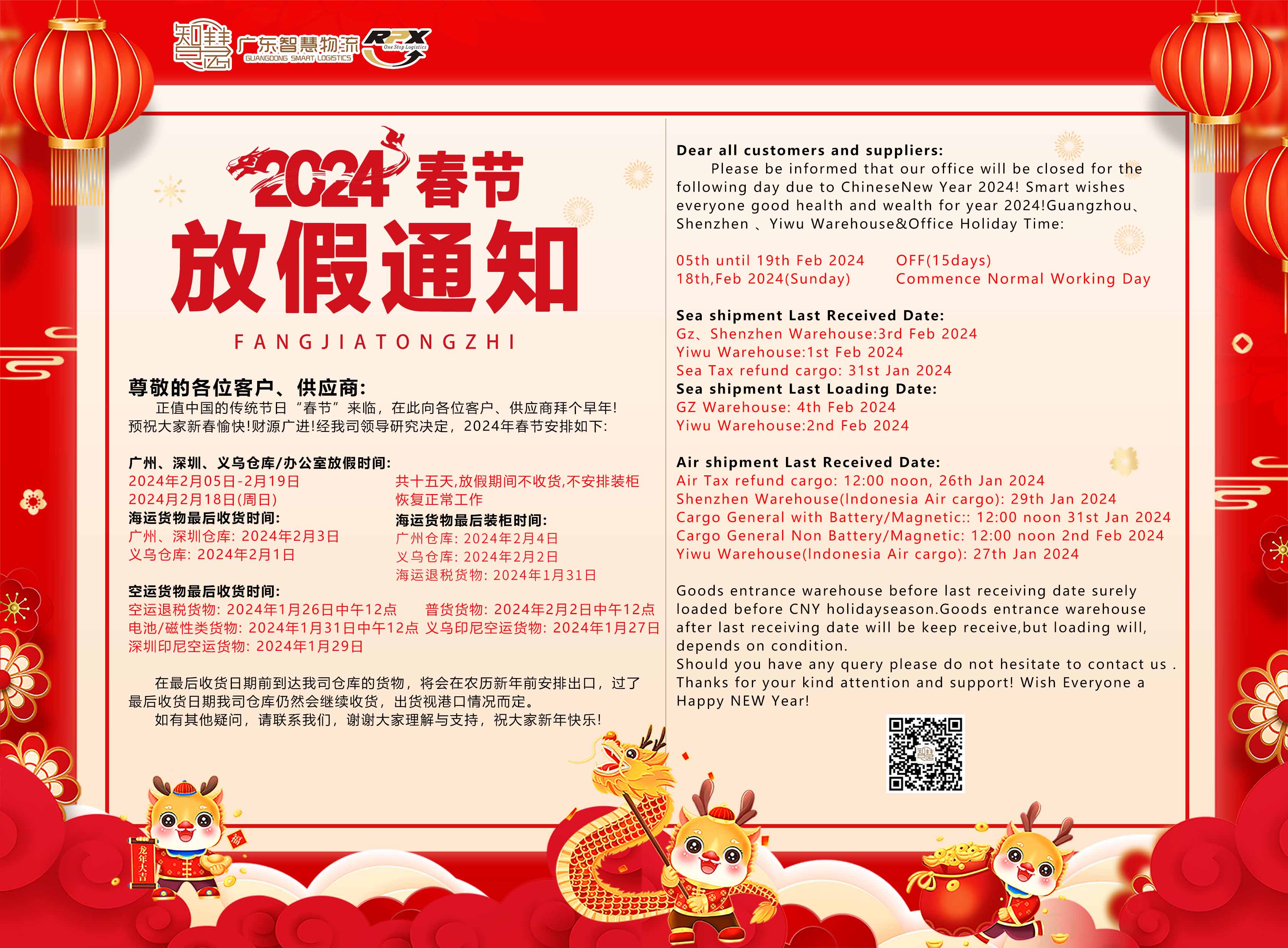 2024年(nián)2月05日(rì)-2月19日(rì) 共十五天,放(fàng)假期間不收貨,不安排裝櫃